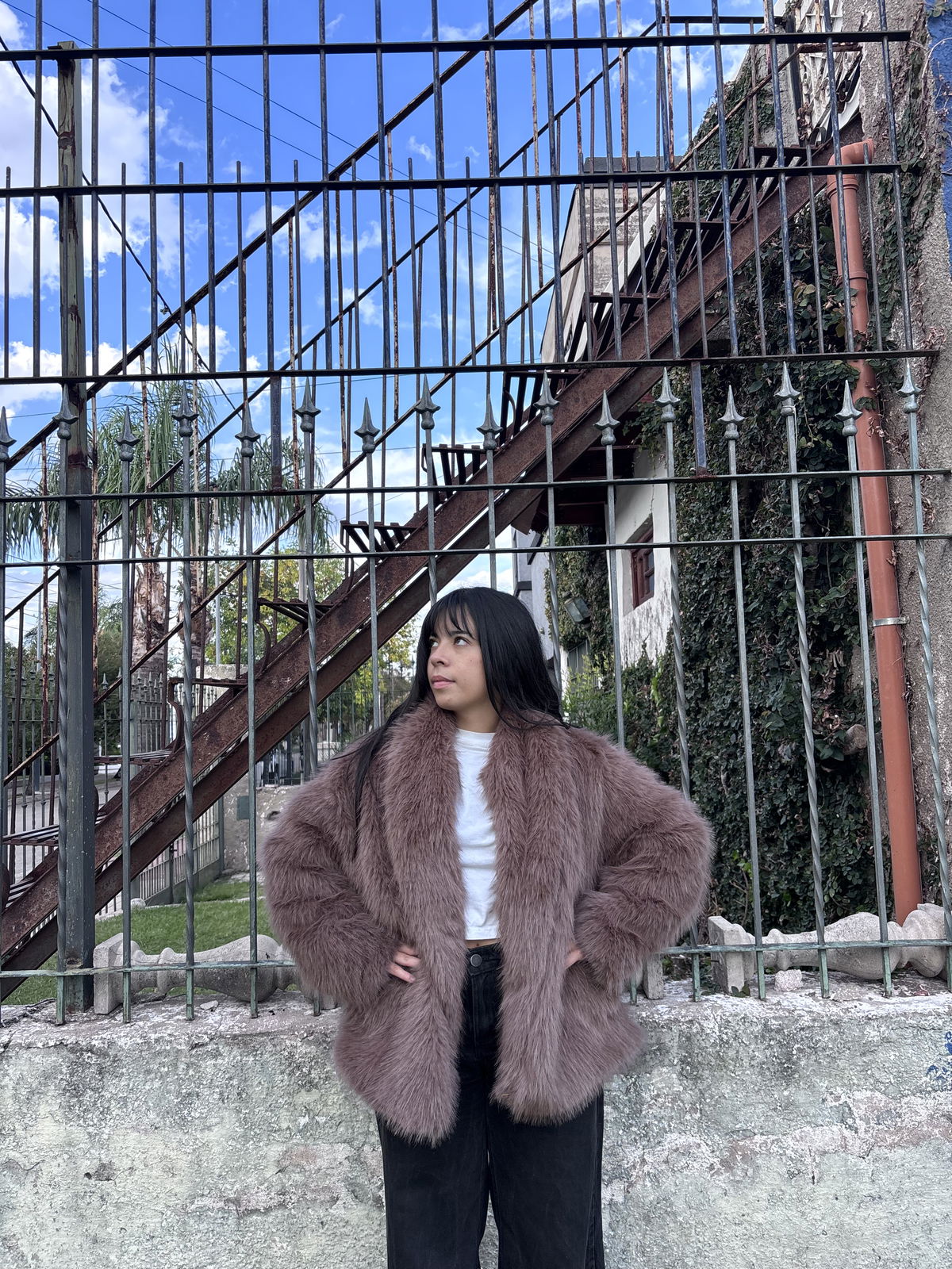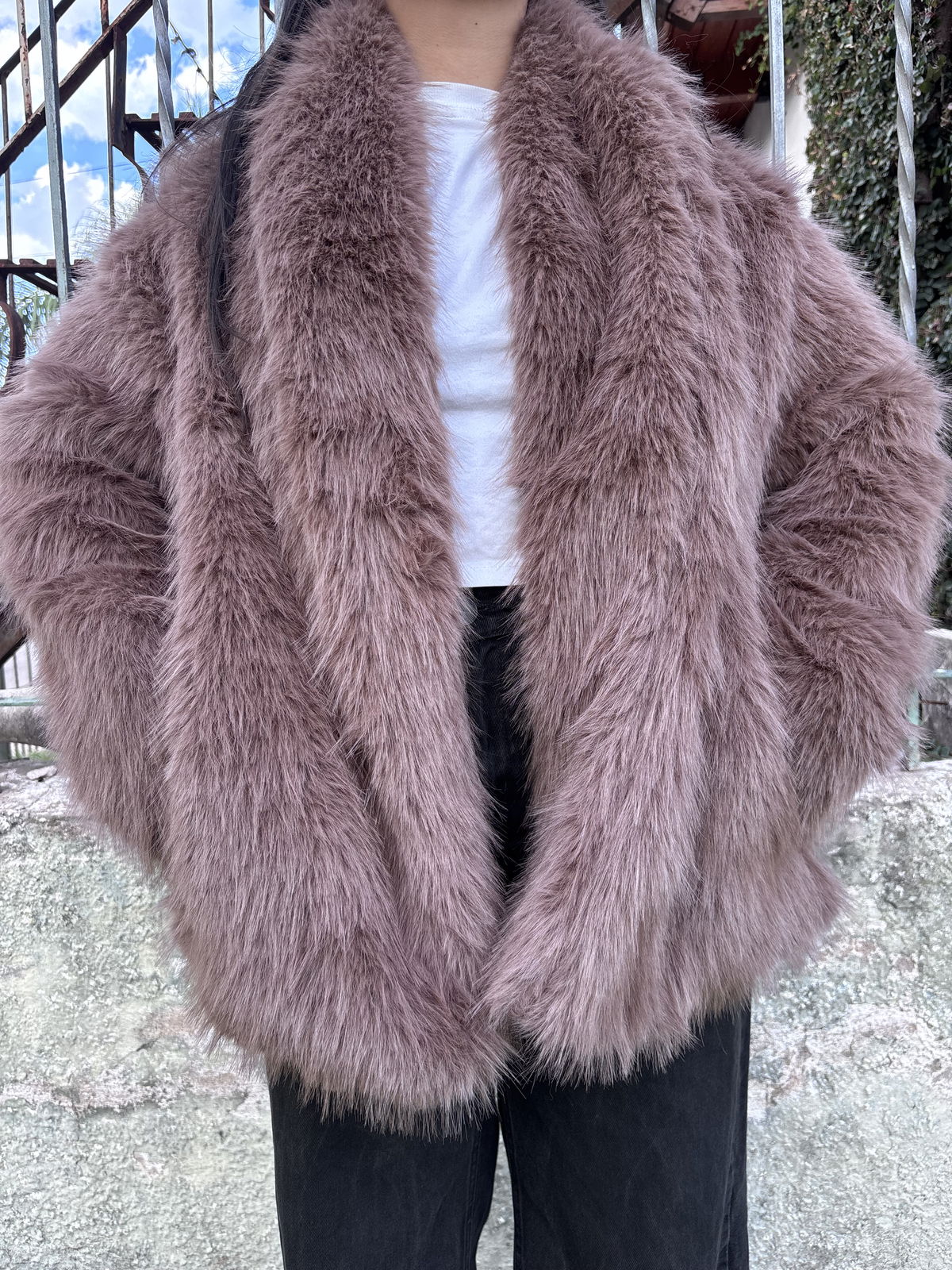 Tapado piel sintética, talle 2. (La modelo usa talle 2) color visón.