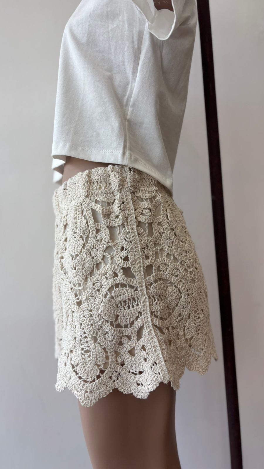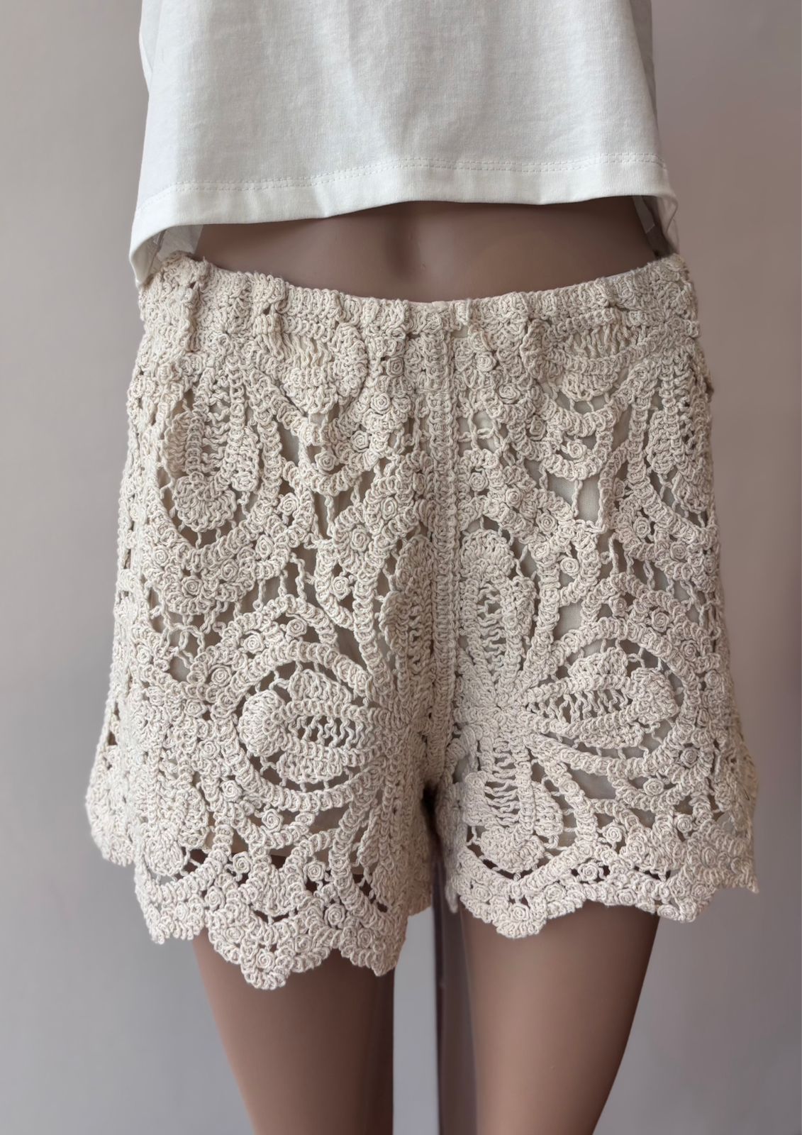 Short de encaje crochet, con motivo floral y terminación artesanal. Con forro interno. Talle L (también va para un M)
